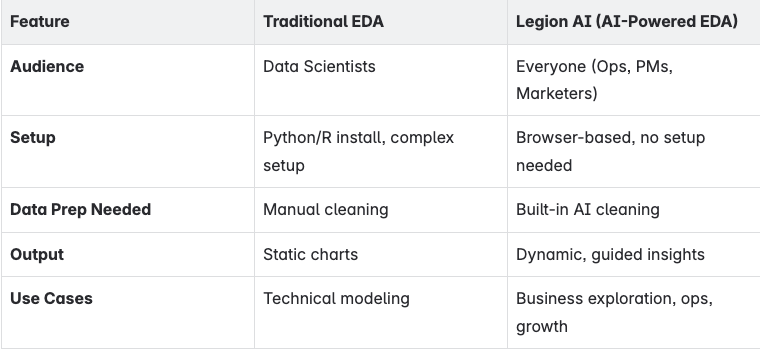 Whether you’re a software engineer, product manager, or growth marketer, modern EDA tools like ours at Legion AI make exploring data as easy as asking a question. No code, no setup, just straight-up insights. It’s super cool and saves a ton of time.