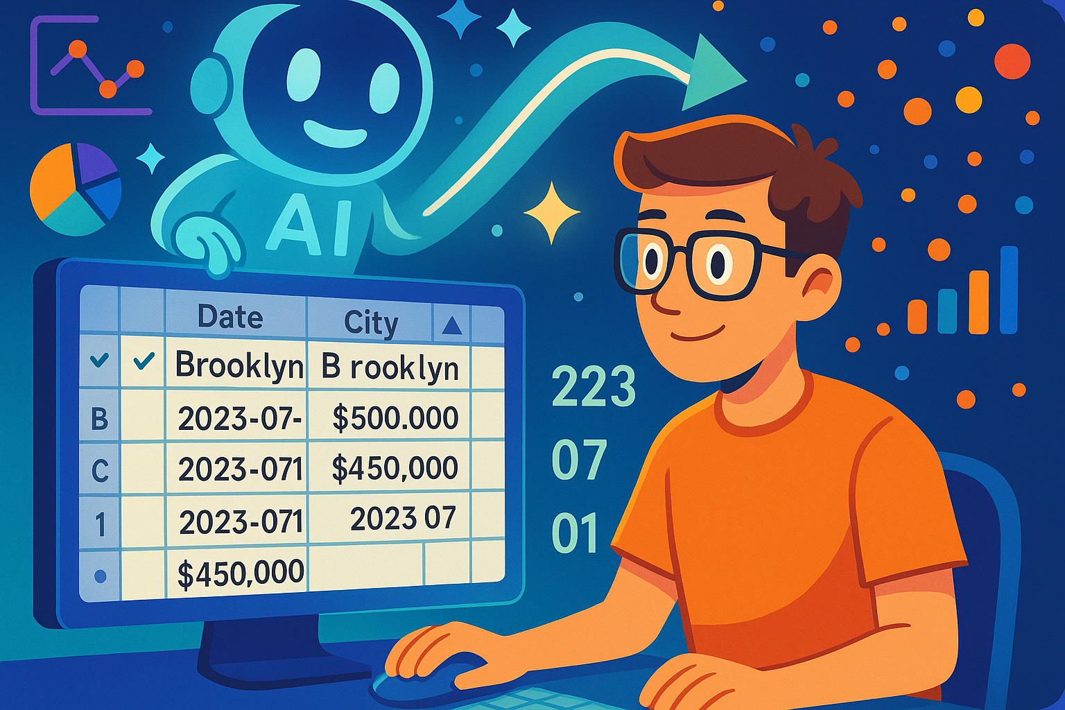 Yikes! You’ve got dates all over the place, missing sale prices, typos like “Brookyln,” and square footage as text or zero. Cleaning this up by hand could take hours, writing Excel formulas to fix dates, guessing what to do with missing prices, and manually correcting typos. It’s a drag and slows down your whole analysis.