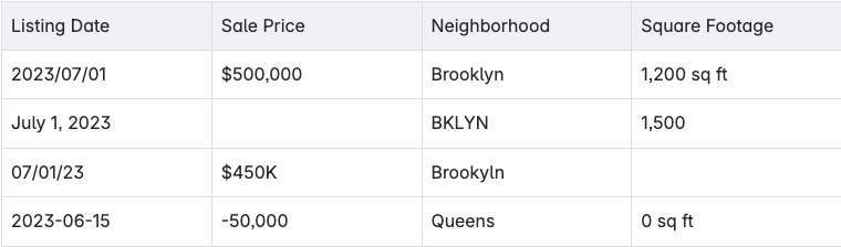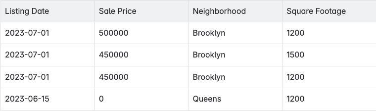 Let’s look at a real estate dataset to see this in action. Imagine you’re analyzing a dataset of home listings with columns for sale price, listing date, neighborhood, and square footage. Here’s a quick peek at what the raw data might look like: